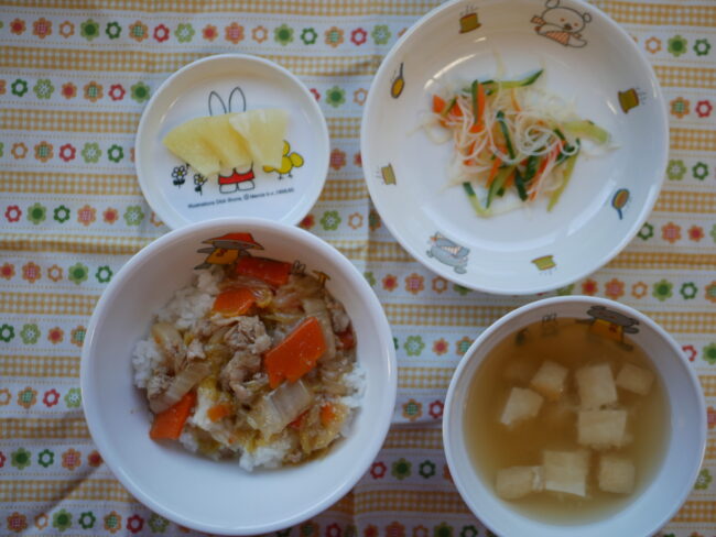 ~ 今日の給食 ~ ・中華丼 ・春雨サラダ ・豆腐と油揚げのみそ汁 ・パイン ~ 今日のおやつ ~ ・牛乳 ・ポテトフライ 幼稚部は、姉妹園の草加あおぞら保育園に頂…
