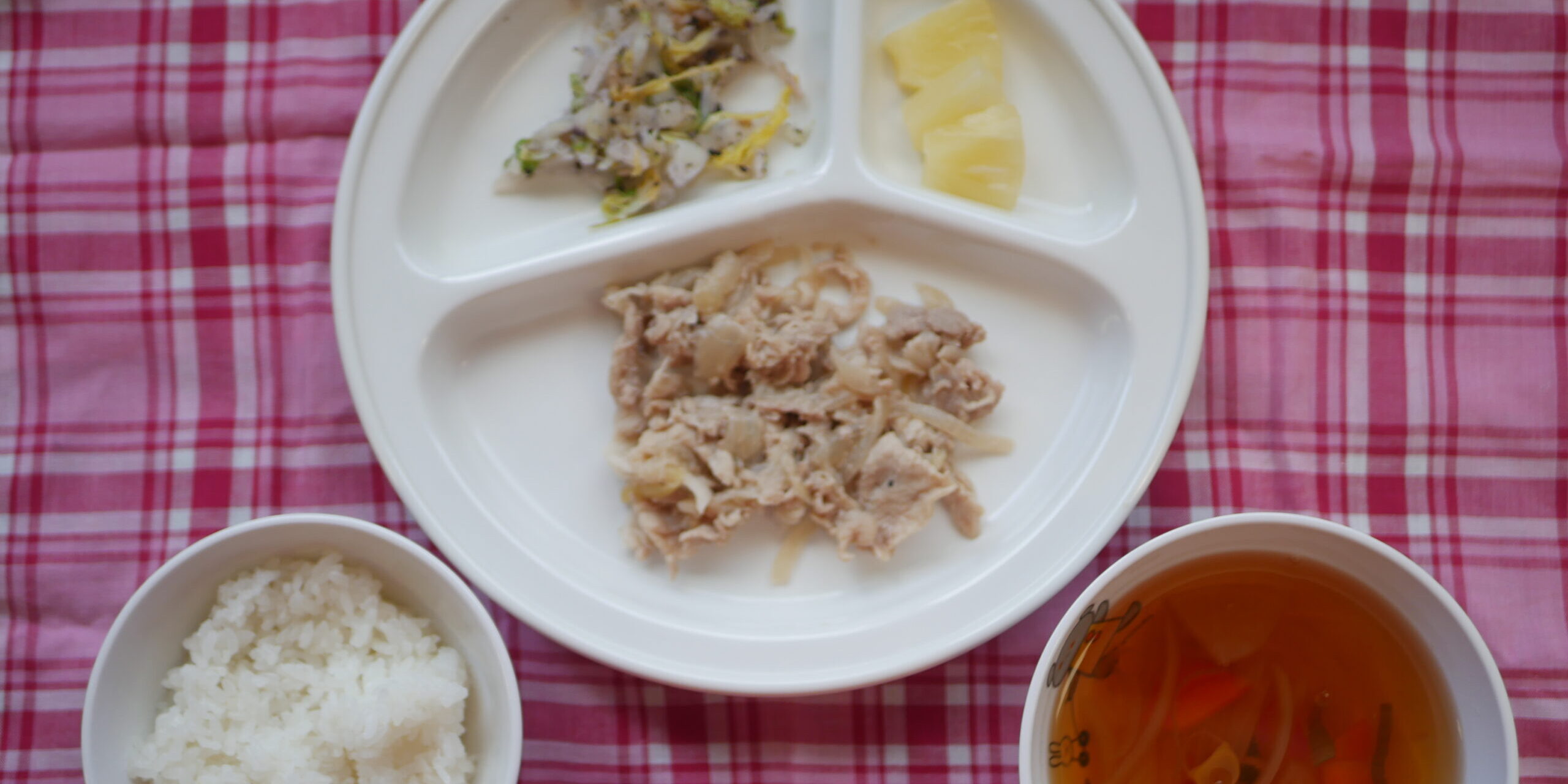 3月42026にじいろ給食ブログ~ 今日の給食 ~ ・豚肉のみそ焼き ・白菜のゆかり和え ・ごはん ・けんちん汁 ・パイン ~ 今日のおやつ ~ ・牛乳 ・りんごゼリー ・ビスケット Post navigationPreviousPrevious post:3月3日(火)NextNext post:3月4日(水)