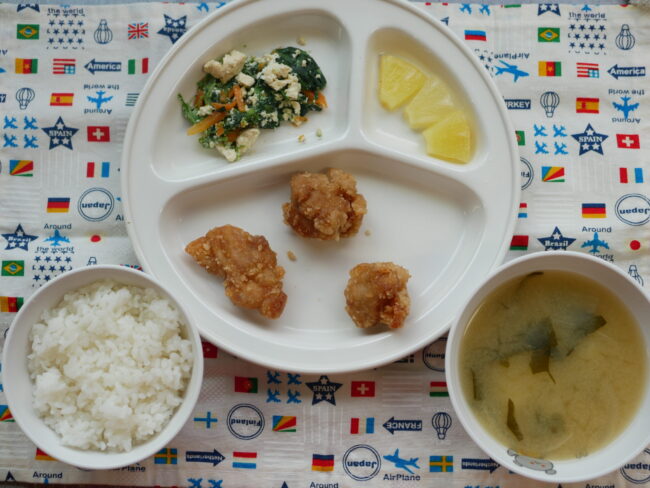 4月7日(火) にじいろ給食ブログBy にじいろ保育園2026年4月7日~ 今日の給食 ~ ・鶏のから揚げ ・ほうれん草の白和え ・ごはん ・じゃがいもと玉ねぎのみそ汁 ・パイン ~ 今日の給食 ~ ・牛乳 ・りんごゼリー ・ビスケット