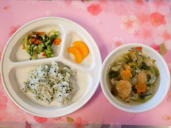 4月8日(水)「お花見メニュー」 にじいろ給食ブログBy にじいろ保育園2026年4月8日~ 今日の給食 ~ ・肉団子スープ ・ブロッコリーと人参和え ・わかめごはん ・みかん ~ 今日のおやつ ~ ・牛乳 ・桜クッキー 今日の給食・午後おやつは「お花見…