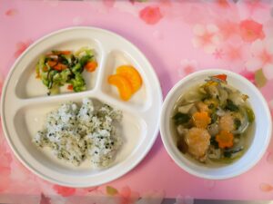 肉団子スープの人参をは桜の形にしました。また、桜クッキーは色もピンクにしました。