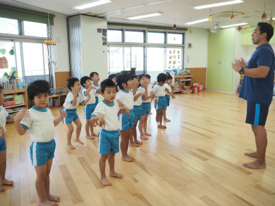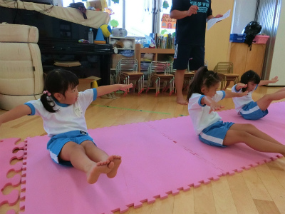 今日は体操教室がありました。 そら組の様子をのぞいてみましょう(#^.^#) まずは準備体操です。 てっちゃん先生の真似をしてしっかり体操します! 手をブラブラ~足もブラブラ~ そのあとは、跳…