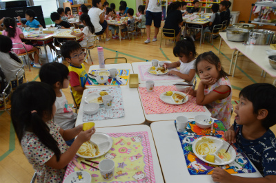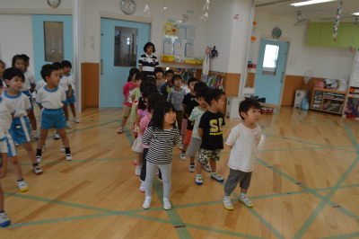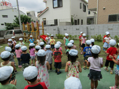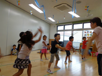 今日は幼稚部とめろん組が園庭で盆踊りの練習をしていました。 夏祭りにむけてみんなラストスパートです。 たいよう組のお兄さんお姉さんを見本として、上手に踊れるようになりましたね。 たくさん体を動かした後は、大…