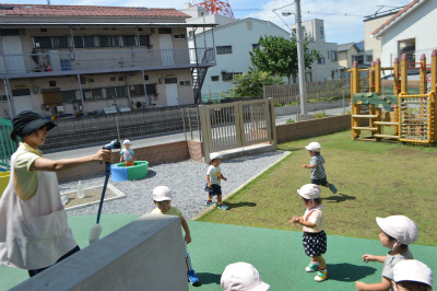 お日様がまぶしい中、いちご組さんは元気に園庭で遊びました。 とても暑かったので、先生がミストを出してくれました。 「わーー!!」と嬉しそうに浴びていました。冷たくて気持ち良かったね。 日陰で一休み。並んで座っている姿がと…