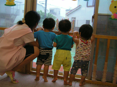 台風9号が上陸して外はすごい雨です。 もも組ではお友達が心配そうに外を見ています。 とても蒸し暑かったので沐浴をした後は木のおもちゃで遊びました。 最近ではお友達と一緒に遊ぶ姿も見られます。 お部屋に流れて…