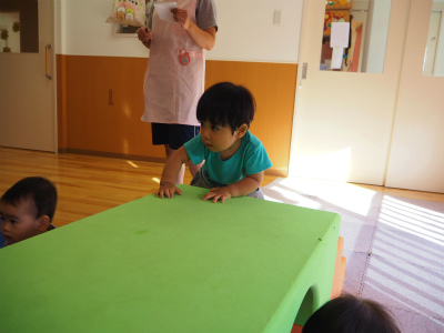 今日のめろん組は英語教室でした。 ゆりこ先生と歌や踊りを楽しみました 今日は新しく「How old are you?」を行い子ども達は手を使って数字を示していたり 「Three」と言える子も多く見られました。 英語教室の…