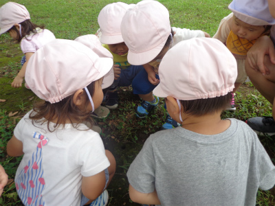 今日はいちご組の様子です(*^-^*) 八幡コミセンに行きました。 着いた途端にみんな一か所で集まって何か見つめています。 何があるか見てみると・・・ アリの巣があ…