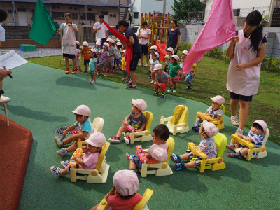今日は0~2歳クラス合同で運動会の予行練習をしました。 初めて外で実際に競技をやってみます。 まずは入場行進です。 しっかりと列を作って歩いています。 続いて開会式の練習です。 めろん組さんはさすが!気を付けの姿勢で立つ…