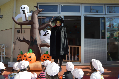 今日は待ちに待ったハロウインの日です(*^_^*)☆ 保育部のお友達は園庭に出て魔女さんが来るのを待っていると… 魔女さんがでてきてびっくりした様子でした。 みんな「トリックアー…