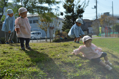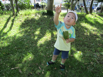 今日のめろん組はしのは公園に行きました。 自分たちの散歩バックを持っていき、何を集めようかワクワクしていました。 公園につくとたくさんの葉を集め、友達とお気に入りの葉を捜したり 丘に登り、滑ったり、転がったりしていました…