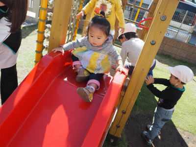 今日は給食室からの火災を想定した避難訓練をしました。 非常ベルの音にびっくりするお友達もいましたが、みんな先生と一緒にしっかり参加していました。 訓練が終わるともも組さんは園庭で遊びました。 高いところから…