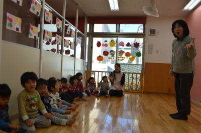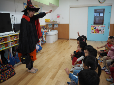 今日は、ほし組です! 魔女の恰好をした先生が登場して 英語教室が始まりました。 みんなワクワクしながらお話を聞いています。 まずは、先生の動きを真似しながらおばけになり、お歌を歌いました。 …
