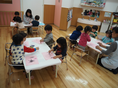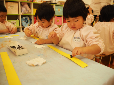 今日のめろん組では節分に向け豆箱を作りました。 のりを使うのも慣れてきて子供たちも自分たちで塗ることができていました。 どこにどのように貼ろうか友達と話し合いながら決めていました。 この黒の折り紙も子供たちでちぎったもの…