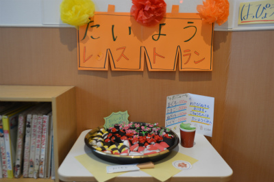 今、たいよう組では遊びの中で「レストラン」を開いています。 子ども達でお寿司を作りました。とても完成度が高くどれも美味しそうです。 今後、色々とメニューが増えていくそうなのでとても楽しみです! さて、今日は今年度で最後の…