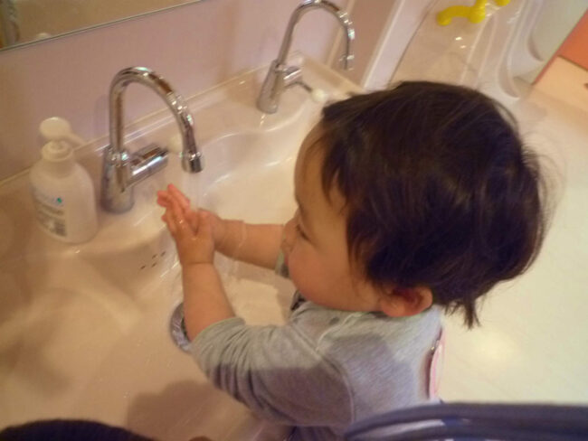 今日はもも組さんの手を洗う様子です。 最近はお散歩から帰ってきたら手を洗うのですが、 もも組の子どもたちは手を洗うことがとても上手です。 ごしごしと手を洗ったり 先生に「おそでぎゅっしてね」と声かけられると 「ぎゅっ」と…