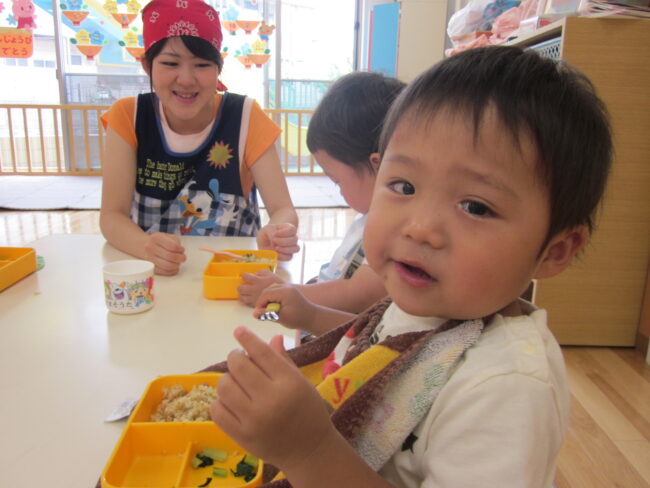 今日は土曜なので合同保育です(*^_^*) 午前は幼稚部さんと園周りにお散歩に行き、その後は園庭で遊びました。 今日の給食はチャーハンでみんな大喜び(^O^) 給食を食べた後はお昼寝の時間です…