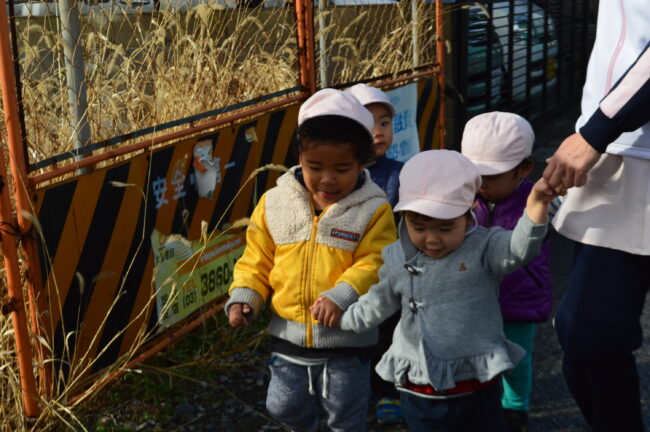 今日はめろん組さんの様子です 発表会も無事に終わり、久しぶりの散歩に出かけました。 お友達同士で手を繋ぎ歩くことも楽しくなっているようです 歩いていると何かを見つけました 皆、「あれはなんだろう」と興味津々です 散歩で季…