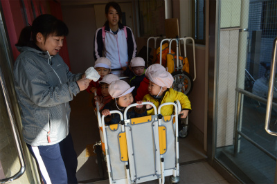 今日は、避難訓練をしました。 地震が発生したという設定で行いました。 一度、園庭に出てから、いちごさんとももさんはカートに乗り そら、たいよう、ほし、めろんぐみさんは歩いて 八幡小学校まで行きました。 みな…