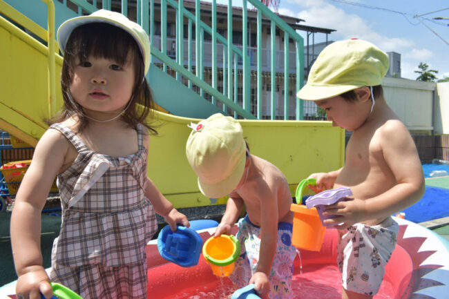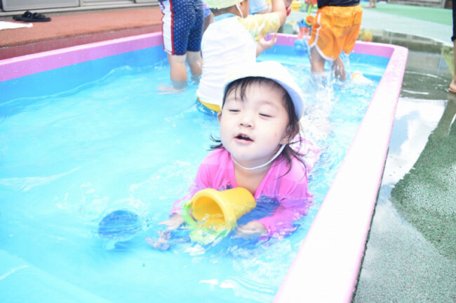 めろん組プール遊びの様子です。 友達と水を掛け合ったり、お舟を浮かせたりして楽しく遊びました。 最後に「明日もプールやろうね~」「やろうね~!」とお友達同士で約束していました。