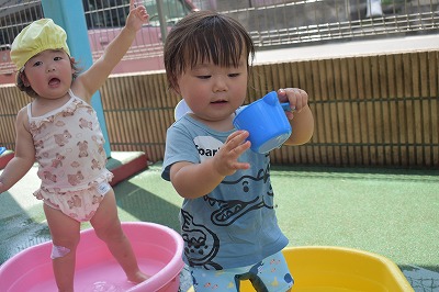 本日はめろん組の様子です☆ お水遊びでは先生にお水をかけようと一生懸命になっている姿や、お水をかけられて『キャーキャー』言っている姿がたくさん見られました。みんなで楽しく遊びました☆