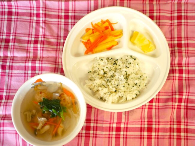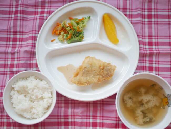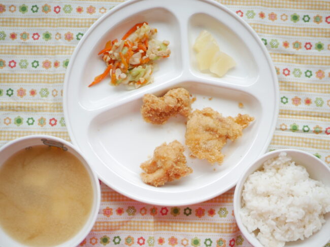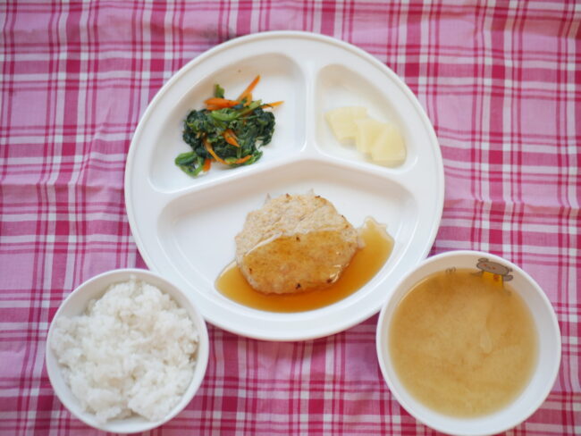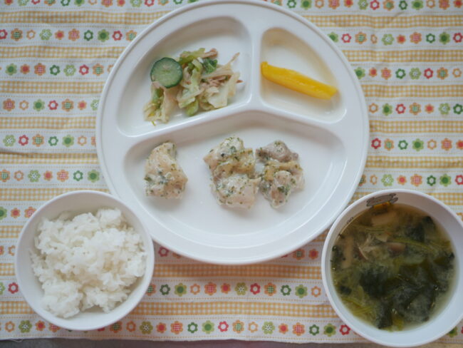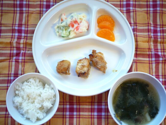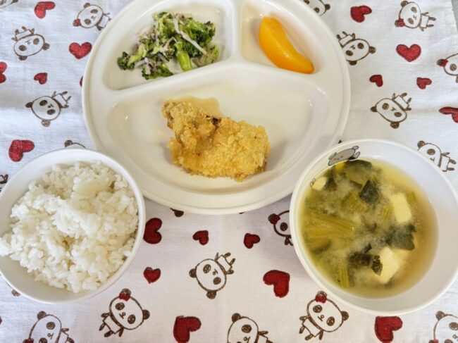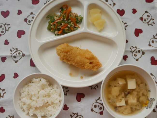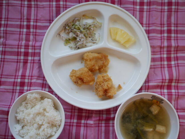 ~ 今日の給食 ~ ・ひと口チキンカツ ・キャベツのゆかり和え ・ごはん ・ほうれん草と油揚げのみそ汁 ・パイン ~ 今日のおやつ ~ ・牛乳 ・ジャムサンド