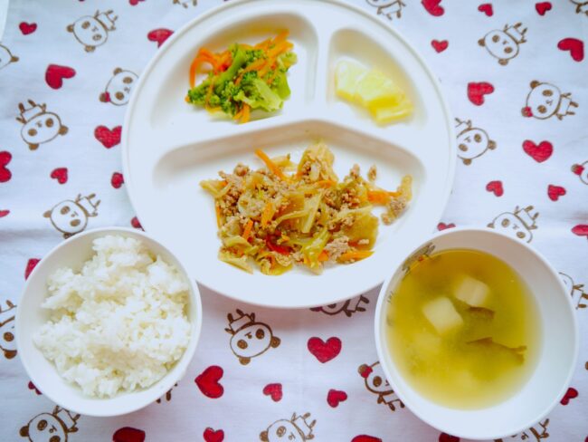 ~ 今日の給食 ~ ・ひき肉の野菜炒め ・ブロッコリーと人参のごま和え ・ごはん ・お麩とわかめのみそ汁 ・パイン ~ 今日のおやつ ~ ・牛乳 ・クッキー
