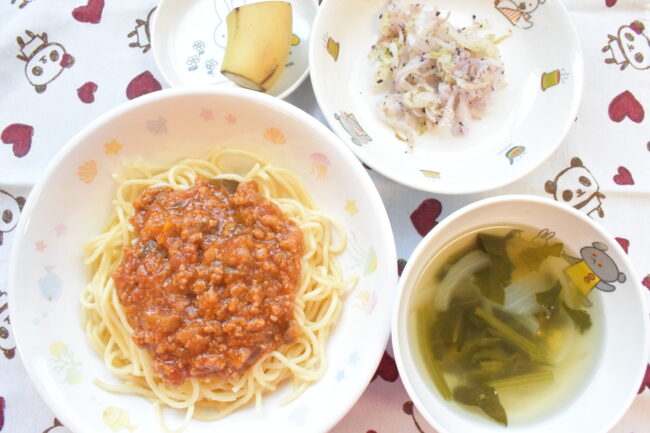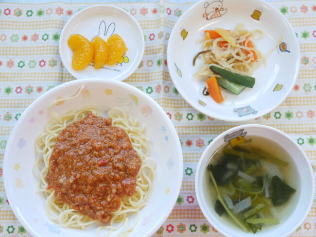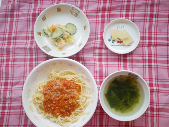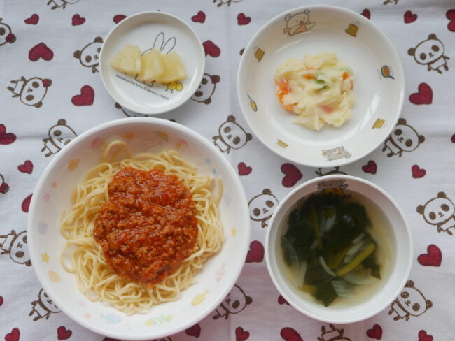 ~ 今日の給食 ~ ・ミートソーススパゲティー ・ポテトサラダ ・ほうれん草とコーンのスープ ・パイン ~ 今日のおやつ ~ ・牛乳 ・わかめおにぎり