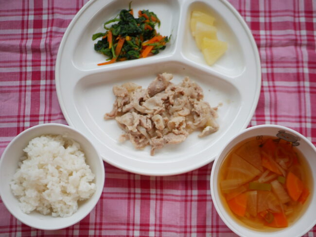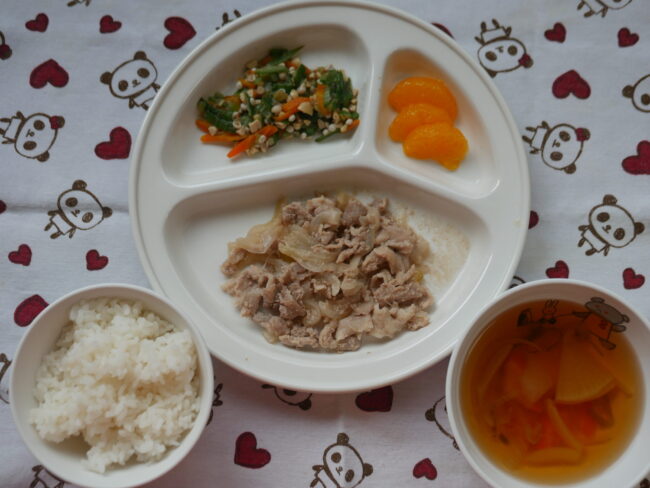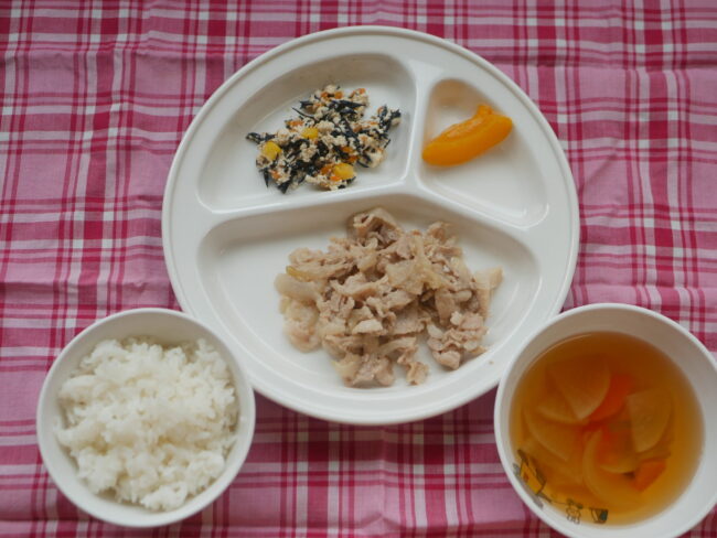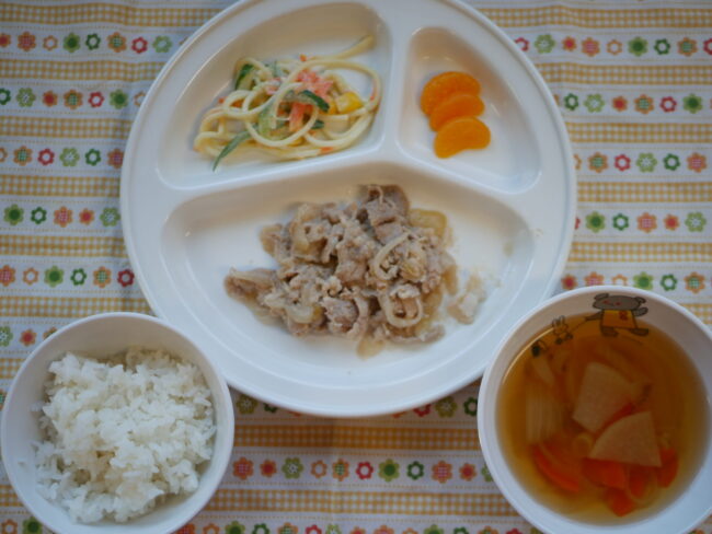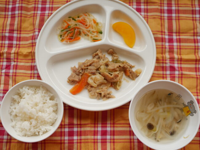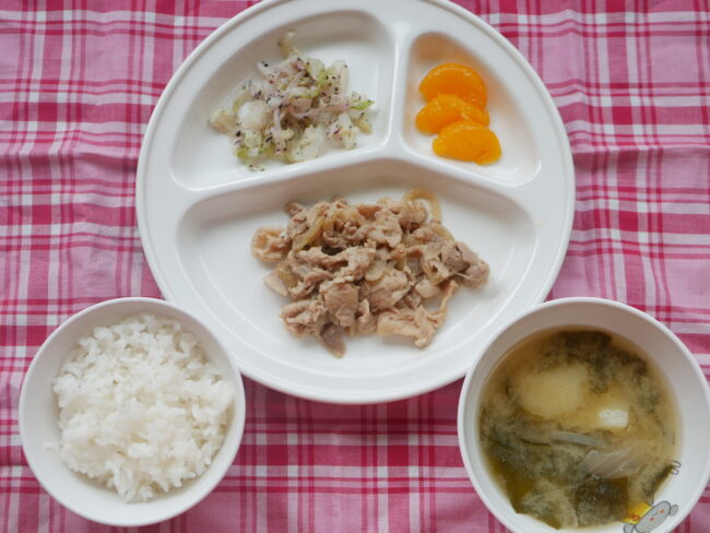 ~ 今日の給食 ~ ・豚肉の生姜焼き ・キャベツのゆかり和え ・ごはん ・じゃがいもと玉ねぎのみそ汁 ・みかん ~ 今日のおやつ ~ ・牛乳 ・マカロニきな粉