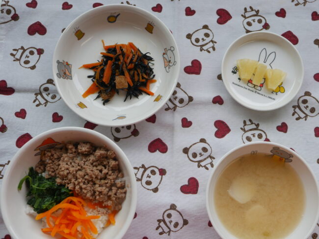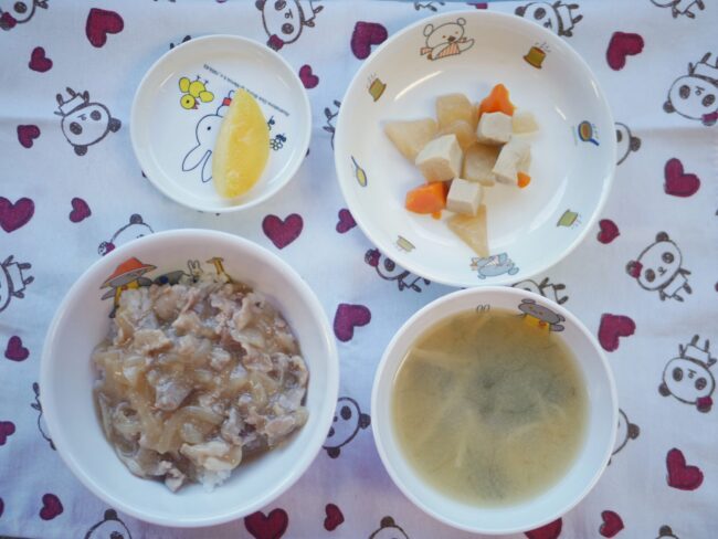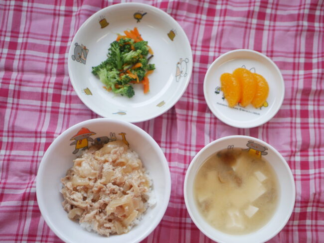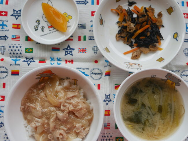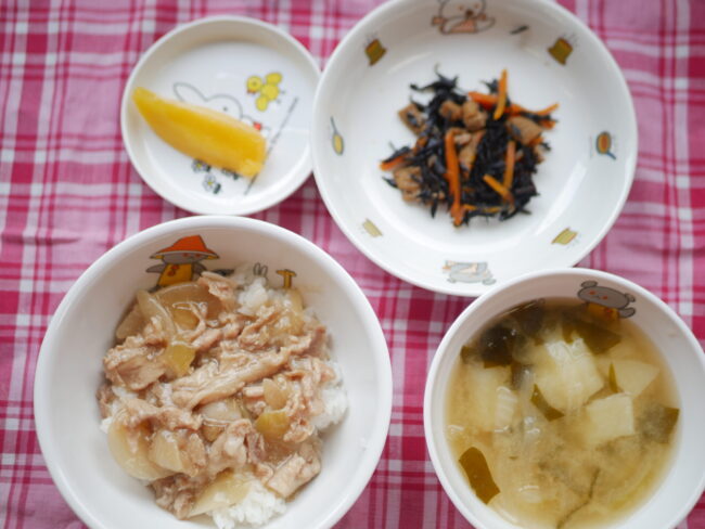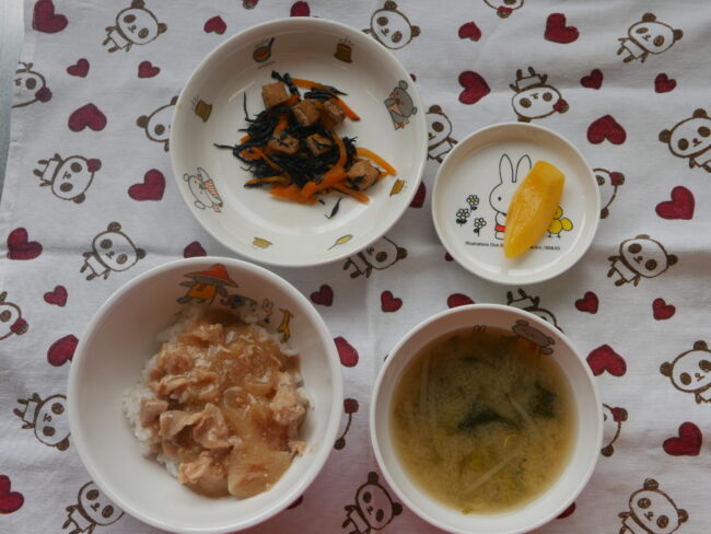 ~ 今日の給食 ~ ・豚丼 ・ひじき煮 ・じゃがいもと玉ねぎのみそ汁 ・もも ~ 今日のおやつ ~ ・えだ豆 ・ビスケット ・えだ豆パンケーキ(もも組)