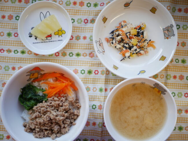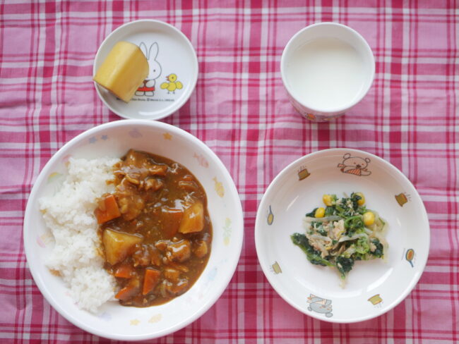 ~ 今日の給食 ~ ・じゃがいものそぼろ煮 ・キャベツのゆかり和え ・ごはん ・ほうれん草と油揚げのみそ汁 ・パイン ~ 今日のおやつ ~ ・牛乳 ・パンケーキ