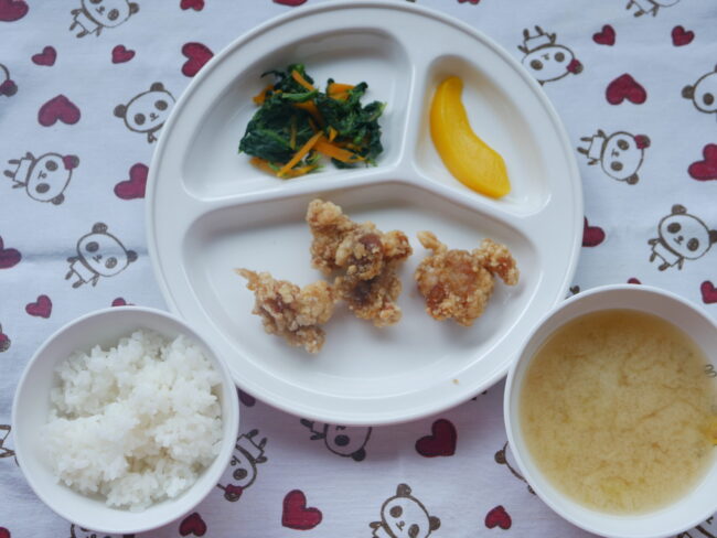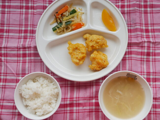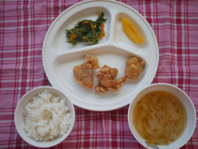 ~ 今日の給食 ~ ・鶏の唐揚げ ・ほうれん草と人参のおかか和え ・ごはん ・キャベツともやしのみそ汁 ・もも ~ 今日のおやつ ~ ・牛乳 ・パンケーキ