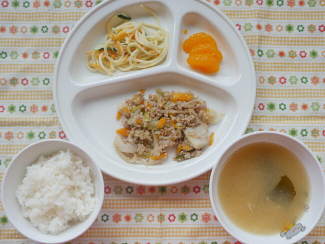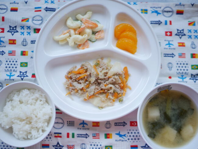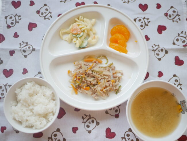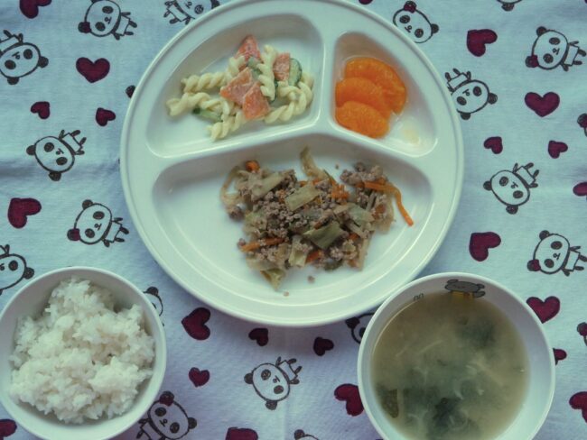 ~ 今日の給食 ~ ・ひき肉の野菜炒め ・マカロニサラダ ・ごはん ・わかめとえのきのみそ汁 ・みかん ~ 今日のおやつ ~ ・牛乳 ・パンケーキ