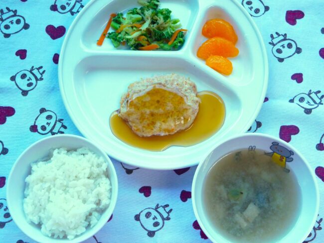 ~ 今日の給食 ~ ・デミグラスソースハンバーグ ・ブロッコリーと人参のおかか和え ・ごはん ・キャベツともやしのみそ汁 ・みかん ~ 今日のおやつ ~ ・麦茶 ・コーンフレーク