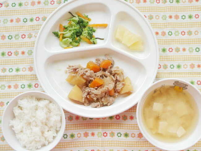~ 今日の給食 ~ ・肉じゃが ・ブロッコリーと人参の昆布和え ・ごはん ・豆腐と油揚げのみそ汁 ・パイン ~ 今日のおやつ ~ ・牛乳 ・きな粉蒸しパン