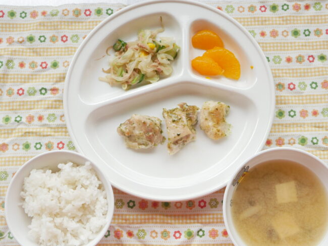 ~ 今日の給食 ~ ・鶏肉の青のり焼き ・キャベツのツナサラダ ・ごはん ・高野豆腐としめじのみそ汁 ・みかん ~ 今日のおやつ ~ ・牛乳 ・お麩ラスク