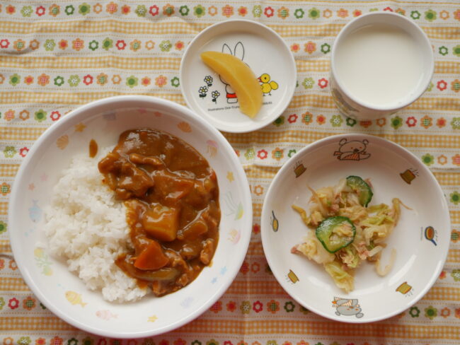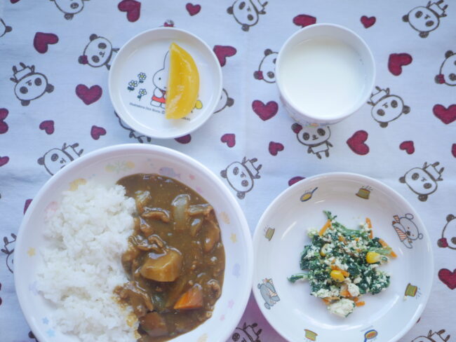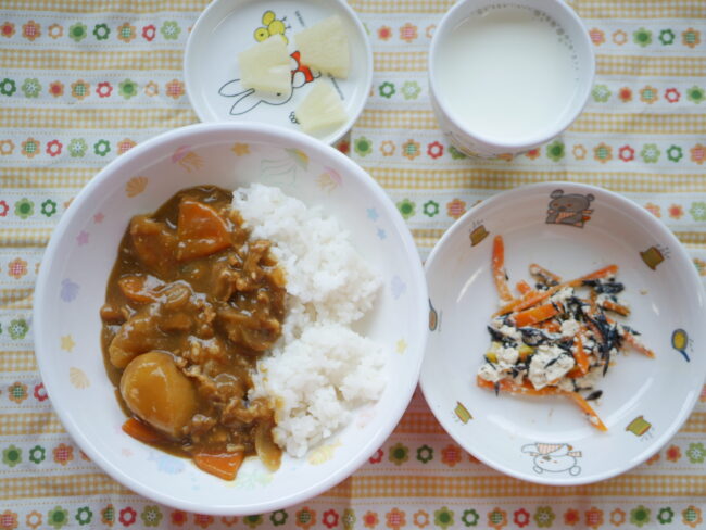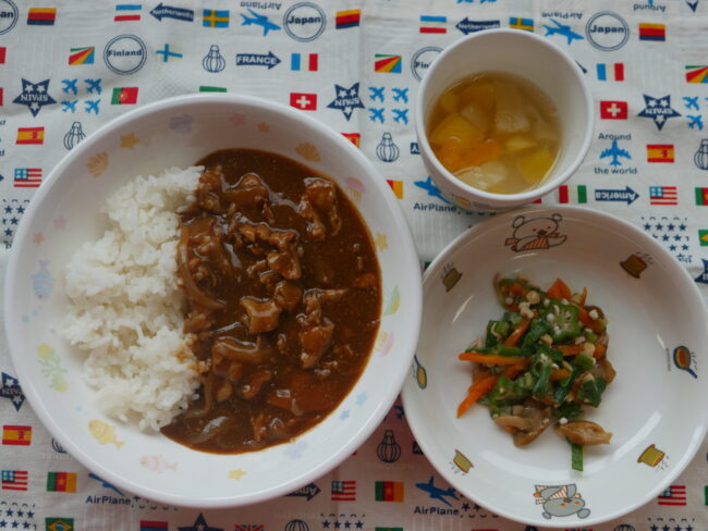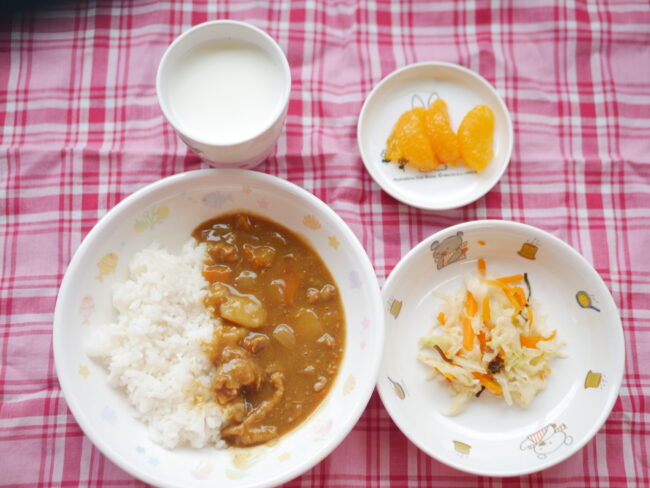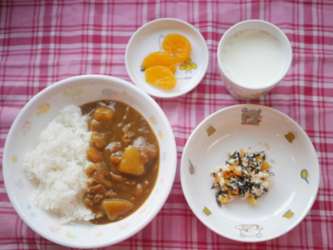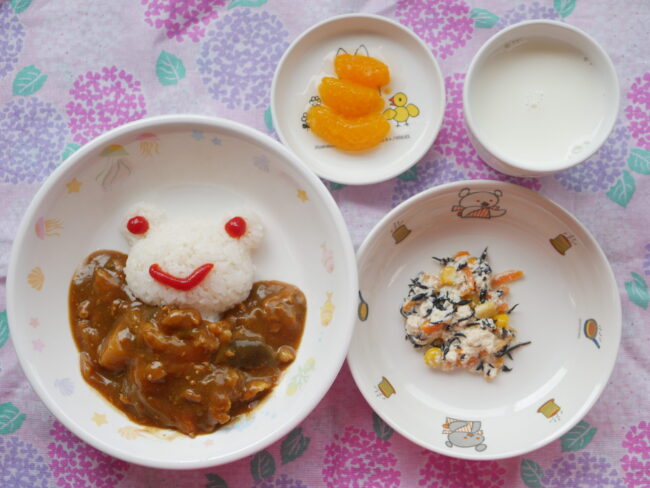 ~ 今日の給食 ~ ・ケロケロカレーライス ・ひじきの白和え ・牛乳 ・みかん ~ 今日のおやつ ~ <保育部> ・麦茶 ・あじさいゼリー ・ビスケット <幼稚部>…