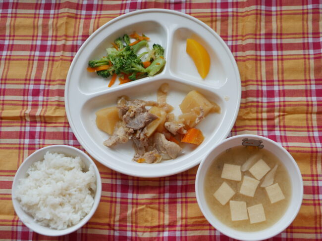 ~ 今日の給食 ~ ・豚肉のみそ焼き ・ブロッコリーと人参のおかか和え ・ごはん ・けんちん汁 ・もも ~ 今日のおやつ ~ ・牛乳 ・ポテトフライ