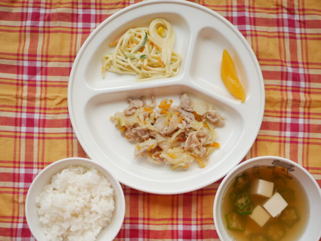 ~ 今日の給食 ~ ・豚肉とキャベツのみそ炒め ・スパゲティーサラダ ・ごはん ・豆腐とオクラのすまし汁 ・もも ~ 今日のおやつ ~ ・牛乳 ・お麩ラスク