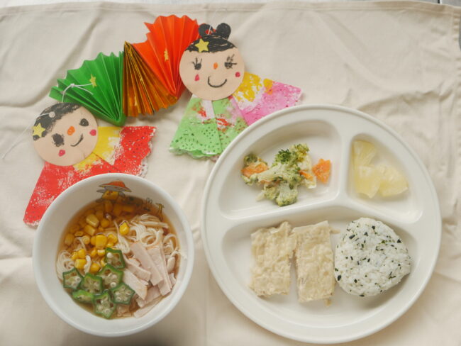 ~ 今日の給食 ~ ・七夕そうめん ・カットしゅうまい ・ブロッコリーと人参のマヨ和え ・わかめおにぎり(幼稚部) ~ 今日のおやつ ~ ・牛乳 ・七夕ゼリー