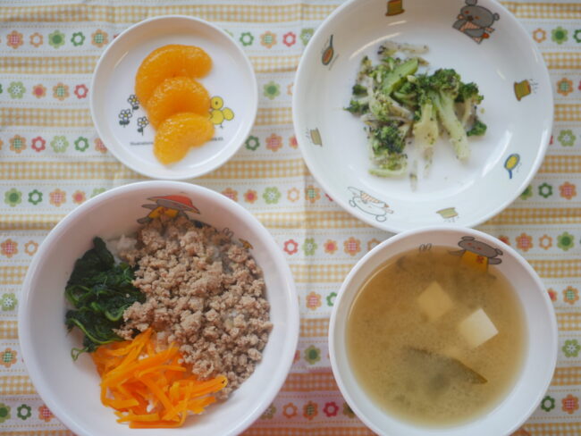 ~ 今日の給食 ~ ・三色丼 ・ブロッコリーのゆかり和え ・豆腐とわかめのみそ汁 ・みかん ~ 今日のおやつ ~ ・牛乳 ・りんごゼリー ・塩せんべい
