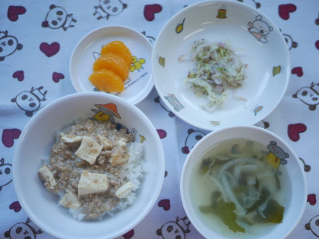 ~ 今日の給食 ~ ・鶏ひき肉と豆腐の落とし揚げ ・三色ナムル ・ごはん ・さつまいもと玉ねぎのみそ汁 ・みかん ~ 今日のおやつ ~ ・牛乳 ・きな粉蒸しパン