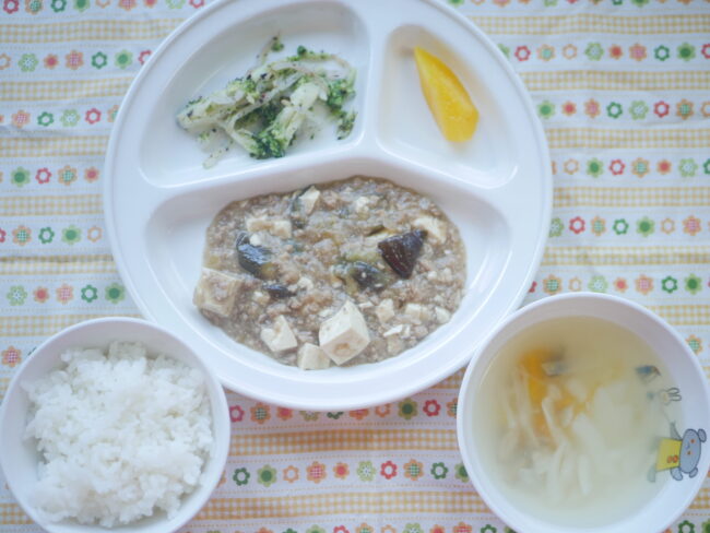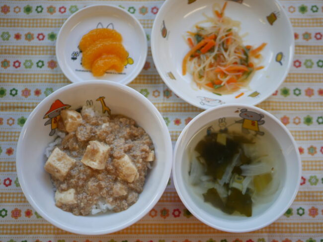 ~ 今日の給食 ~ ・肉豆腐 ・ブロッコリーとコーンの和え物 ・ごはん ・わかめとえのきのみそ汁 ・みかん ~ 今日のおやつ ~ ・牛乳 ・ぶどうゼリー ・ビスケット