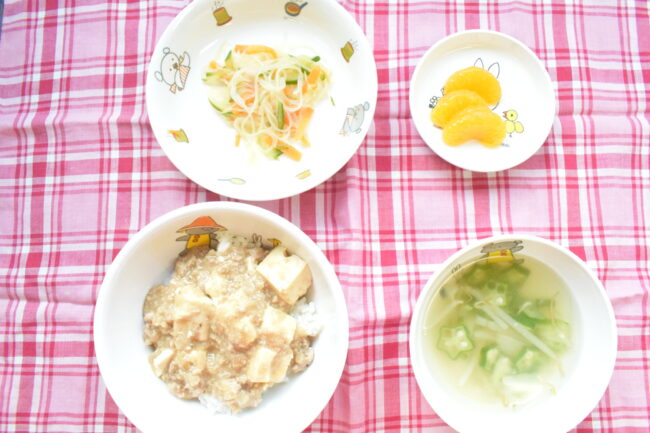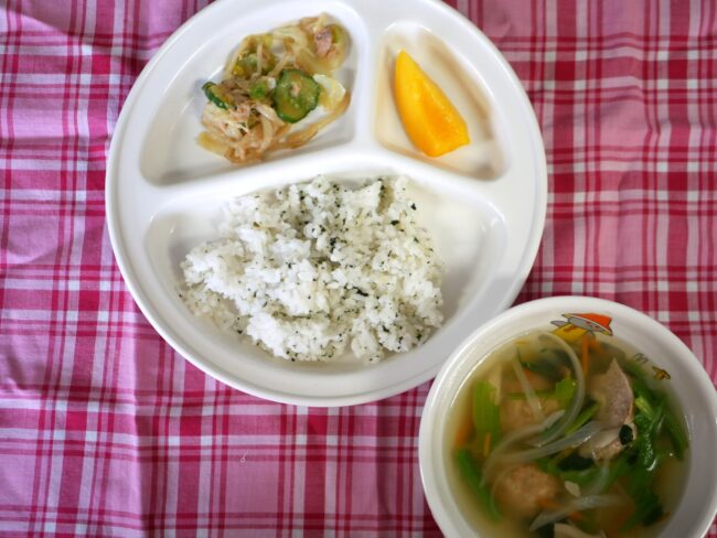~ 今日の給食 ~ ・ひと口チキンカツ ・オクラの納豆和え ・ごはん ・ほうれん草ともやしのみそ汁 ・もも ~ 今日のおやつ ~ ・牛乳 ・芋もち田楽