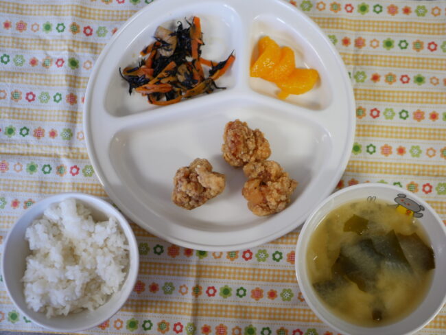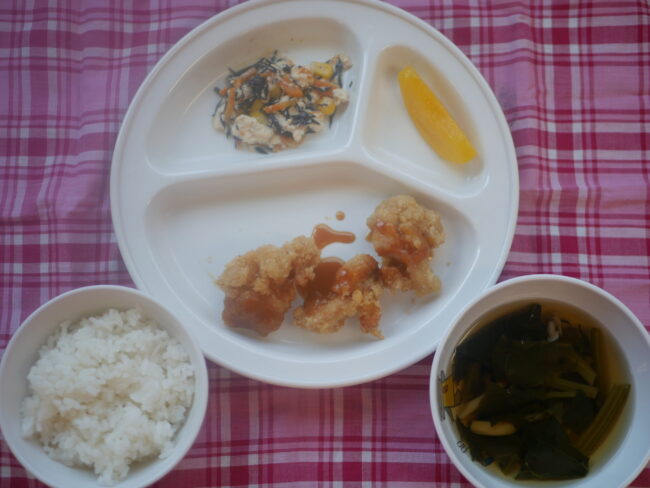 ~ 今日の給食 ~ ・鶏の唐揚げ ・ほうれん草と人参のおかか和え ・ごはん ・キャベツともやしのみそ汁 ・もも ~ 今日のおやつ ~ ・牛乳 ・ひまわりゼリー ・ビスケット