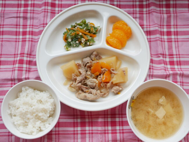 ~ 今日の給食 ~ ・肉じゃが ・ブロッコリーと人参のごま和え ・ごはん ・高野豆腐としめじのみそ汁 ・もも ~ 今日のおやつ ~ ・牛乳 ・冷やしたぬきうどん