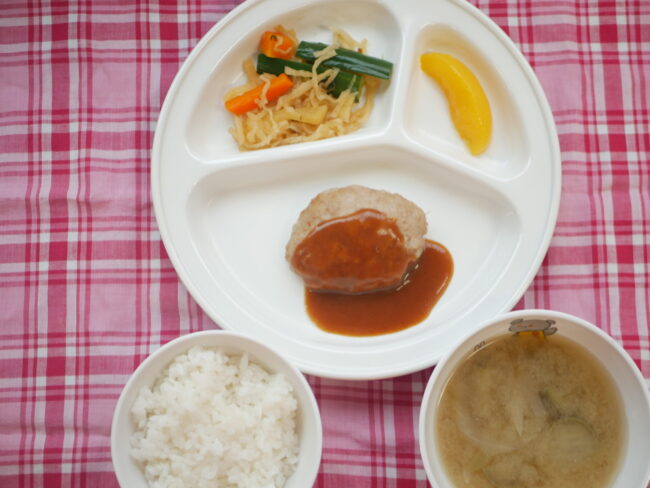 ~ 今日の給食 ~ ・デミグラスソースハンバーグ ・カミカミサラダ ・ごはん ・なすと玉ねぎのみそ汁 ・もも ~ 今日のおやつ ~ ・牛乳 ・お好み焼き