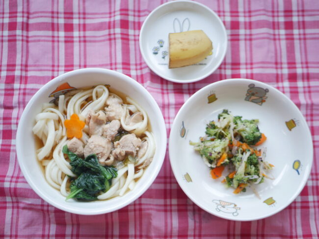 ~ 今日の給食 ~ ・ポークビーンズ ・ブロッコリーと人参の昆布和え ・ごはん ・ほうれん草としめじのみそ汁 ・みかん ~ 今日のおやつ ~ ・牛乳 ・たぬきうどん