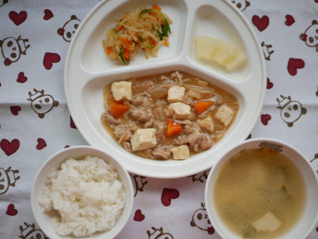 ~ 今日の給食 ~ ・肉豆腐 ・切り干し大根のサラダ ・ごはん ・お麩とわかめのみそ汁 ・パイン ~ 今日のおやつ ~ ・牛乳 ・ポテトフライ
