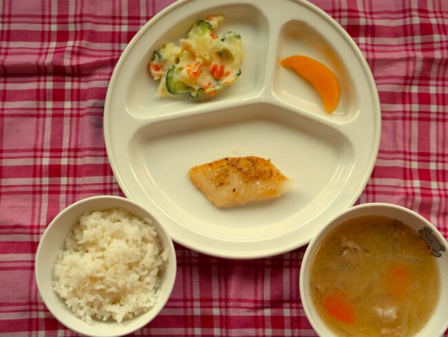 ~ 今日の給食 ~ ・白身魚のフライ ・ブロッコリーのゆかり和え ・ごはん ・豆腐とほうれん草のみそ汁 ・もも ~ 今日のおやつ ~ ・牛乳 ・芋もち田楽