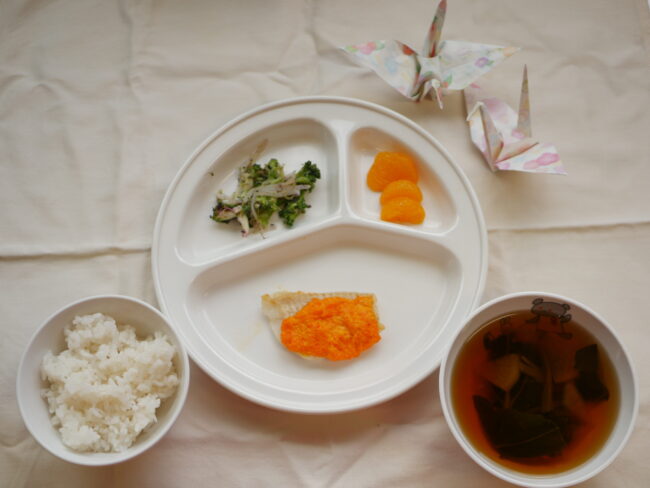 ~ 今日の給食 ~ ・カレイのもみじ焼き ・ブロッコリーのゆかり和え ・ごはん ・てまり麩と野菜のすまし汁 ・みかん ~ 今日のおやつ ~ ・牛乳 ・紅白チュロス …